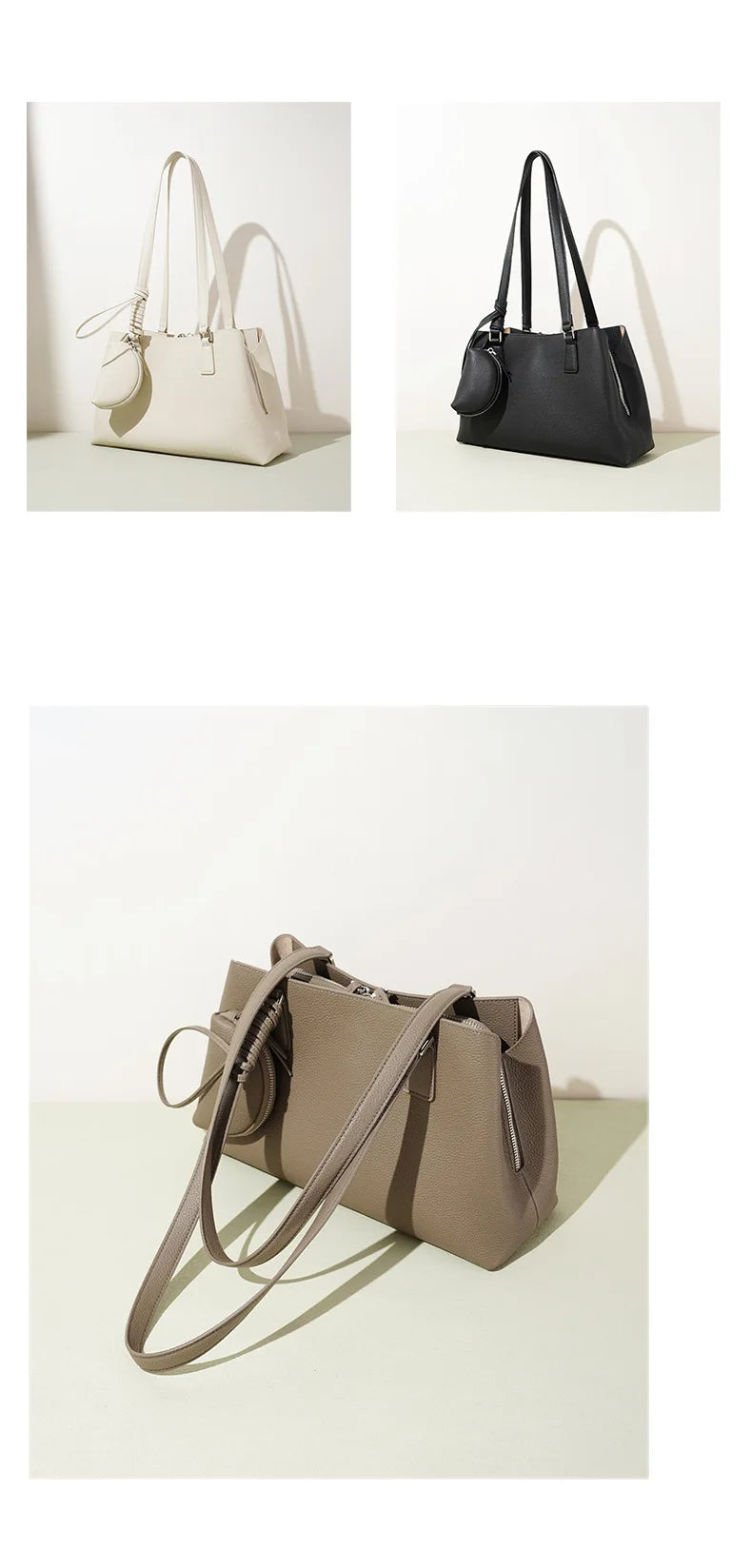 Spacious armpit shopper bag crafted from premium cowhide leather in a sophisticated beige and grey colorway. This versatile handbag features a large capacity design perfect for shopping and daily errands, complete with a matching pouch for extra organization. The comfortable armpit silhouette and shoulder strap make it easy to carry all your essentials in style.
