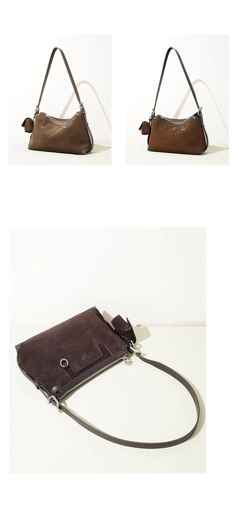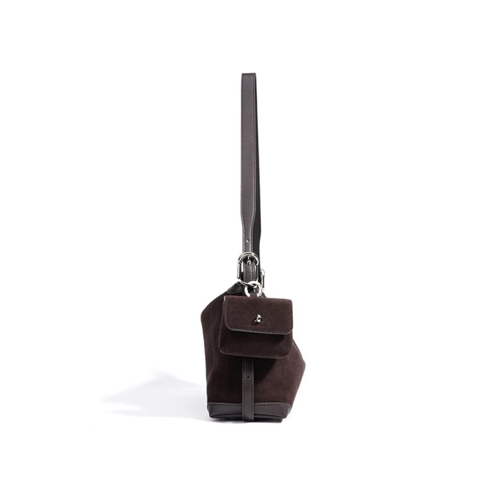 Sleek baguette silhouette in premium suede cowhide leather offers streamlined everyday carry. Attached coin purse keeps small essentials organized, while the keyring clip adds practical convenience. The warm coffee tone pairs effortlessly with any outfit.