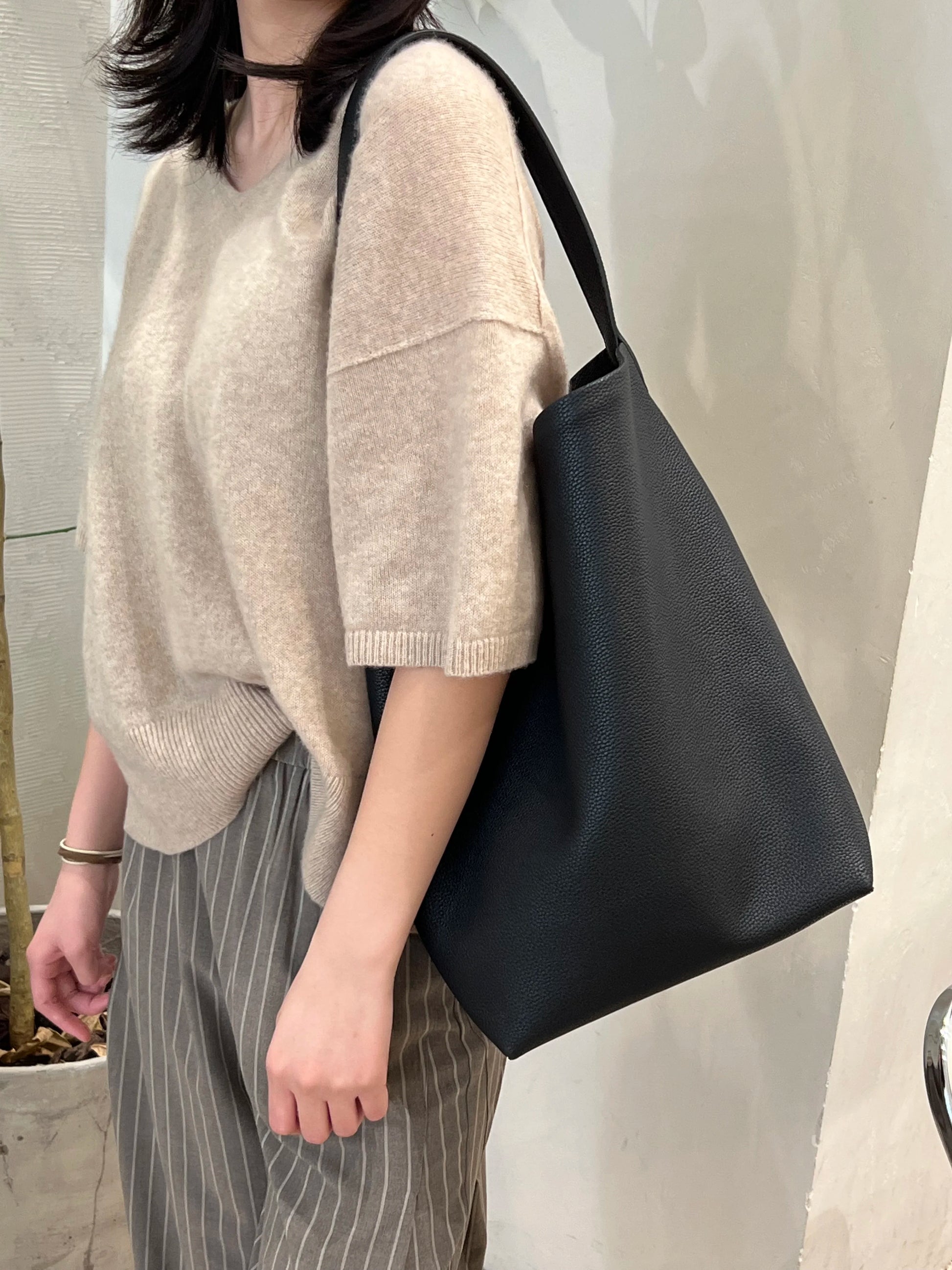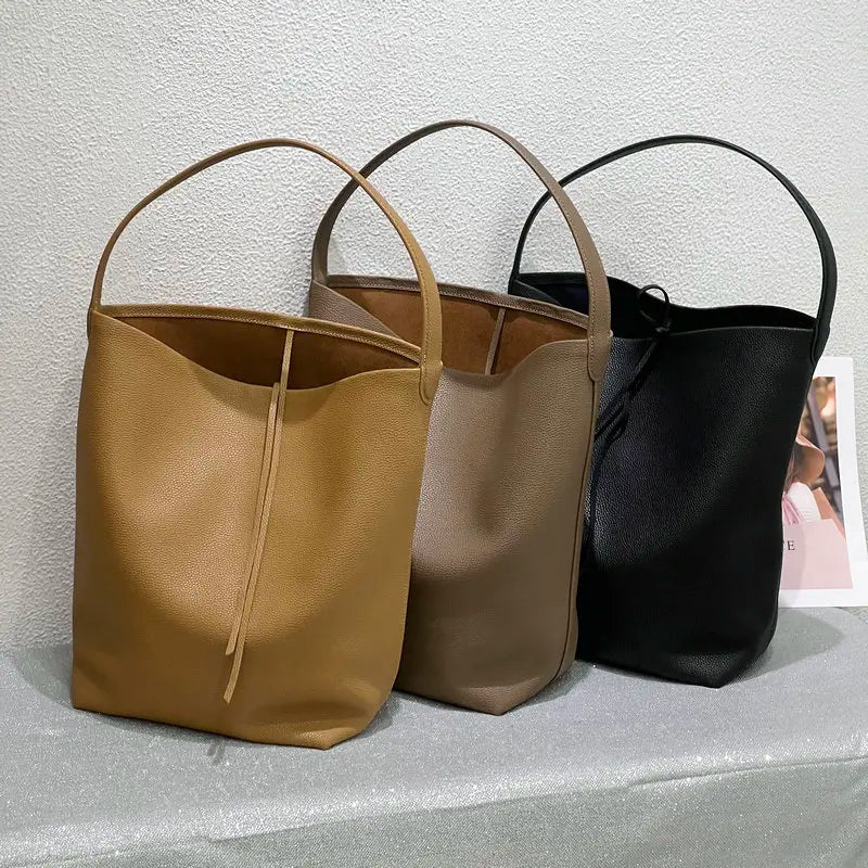 Elegant bucket tote crafted from premium natural cowhide leather in classic black. This versatile shoulder bag combines Euro-French sophistication with Japanese minimalism, featuring a soft, luxurious texture and timeless bucket silhouette.