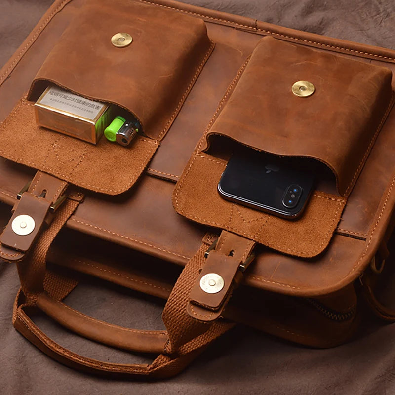 A professional leather briefcase designed to carry your laptop and work essentials. Crafted from genuine leather with a vintage finish, this bag combines classic styling with practical organization for business professionals and daily commuters.
