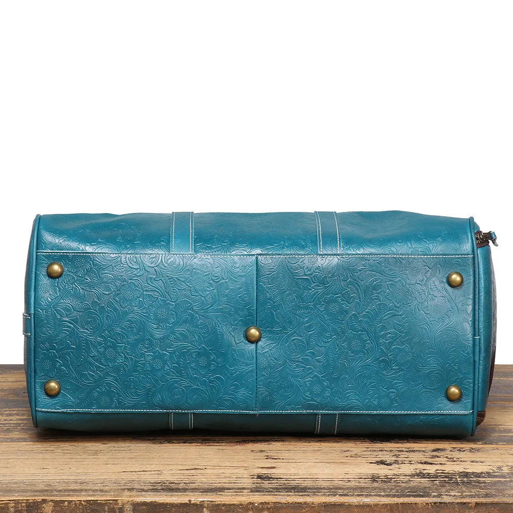 A spacious leather travel duffel designed for weekend trips, gym sessions, and business travel. Crafted from genuine leather with vintage embossed detailing, this large-capacity bag combines durability with classic style for versatile use.
