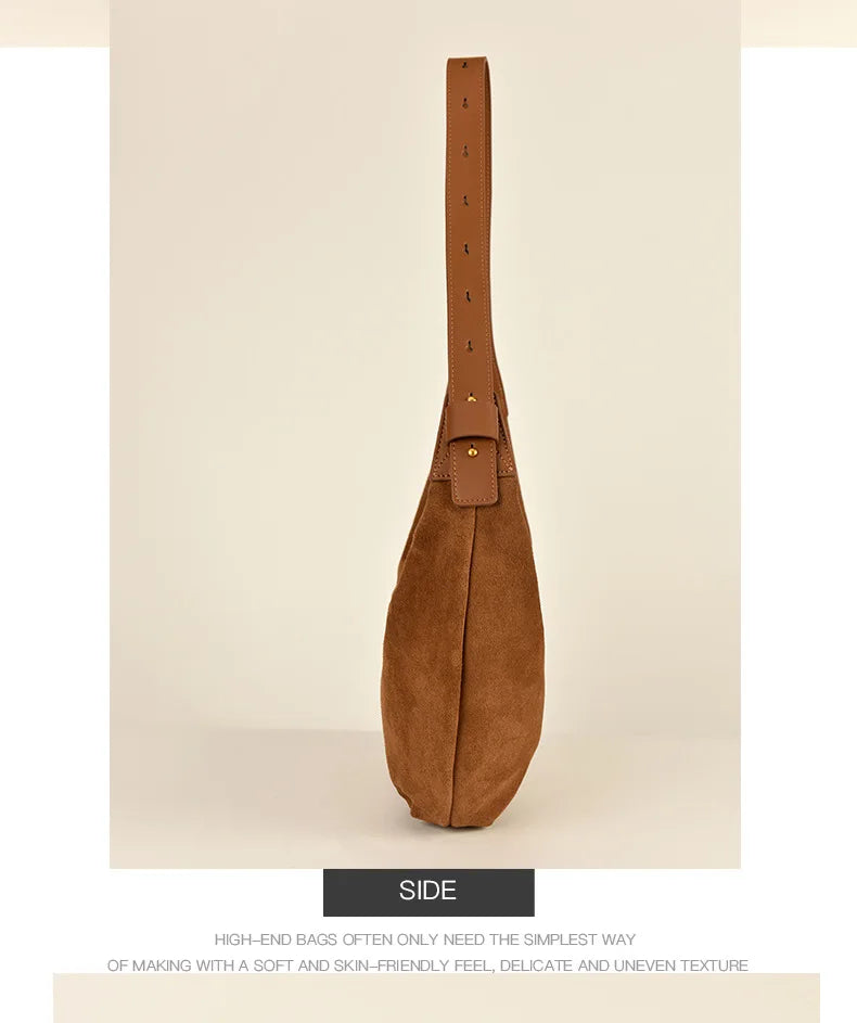 Premium frosted suede hobo with adjustable handle in warm camel coffee tone.