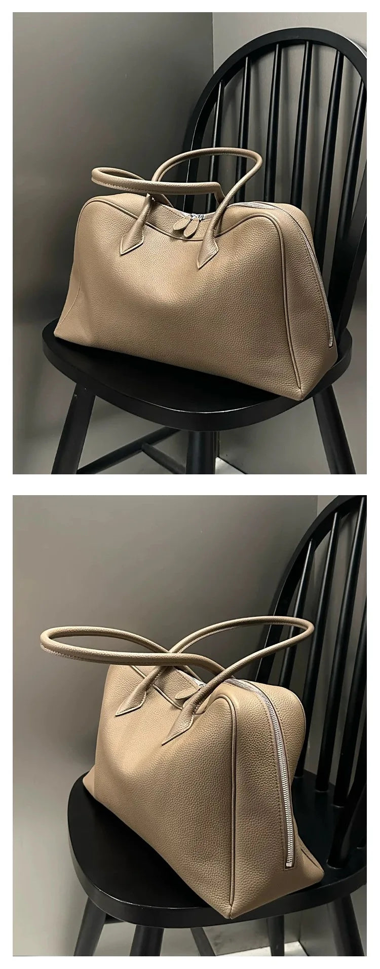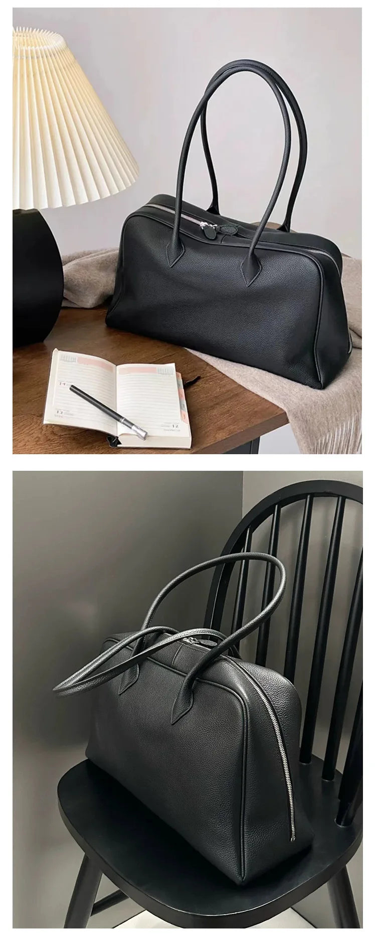A spacious leather tote bag crafted from imported cow leather for daily commutes and travel. This large-capacity bag features a structured design with comfortable shoulder straps, making it ideal for work, business, and everyday use.
