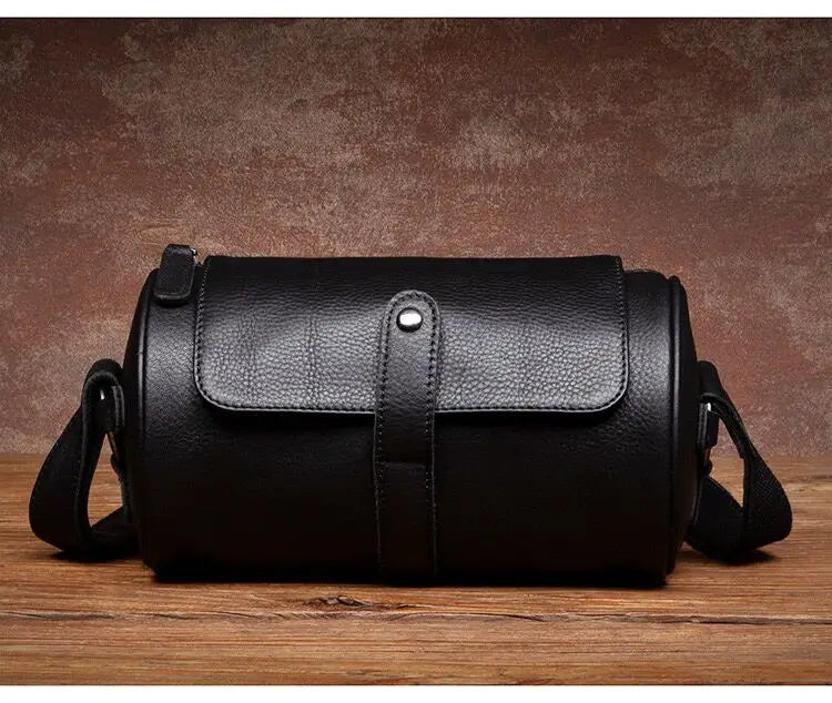 A distinctive handmade leather crossbody bag featuring a unique cylinder bucket design. Crafted from genuine leather with a vintage finish, this bag offers a stylish alternative to traditional bag shapes while maintaining practical everyday functionality.