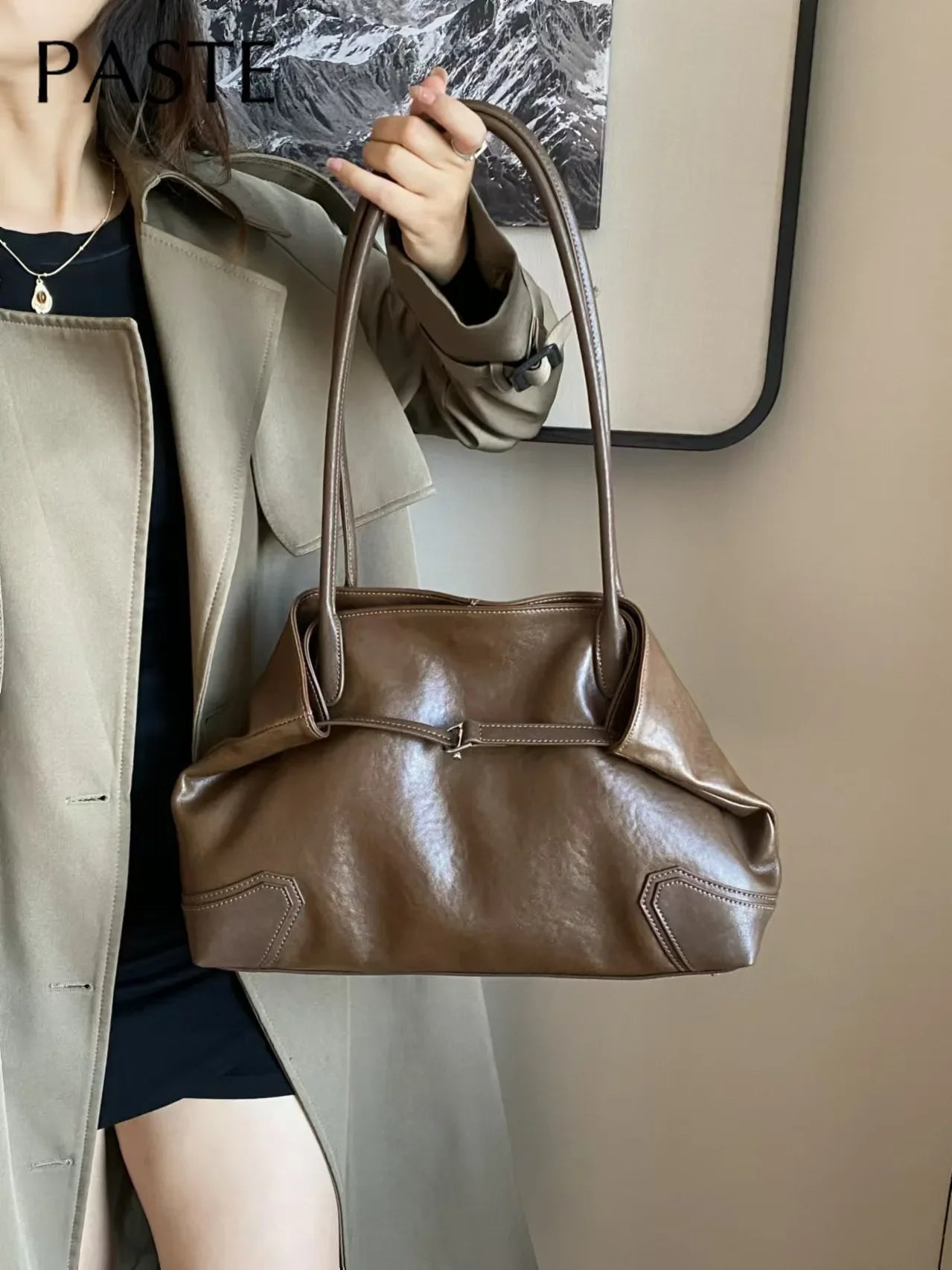 Elegant armpit tote in beige coffee, designed for the modern professional. Handcrafted from genuine first-layer cowhide with long handles for comfortable shoulder carry.